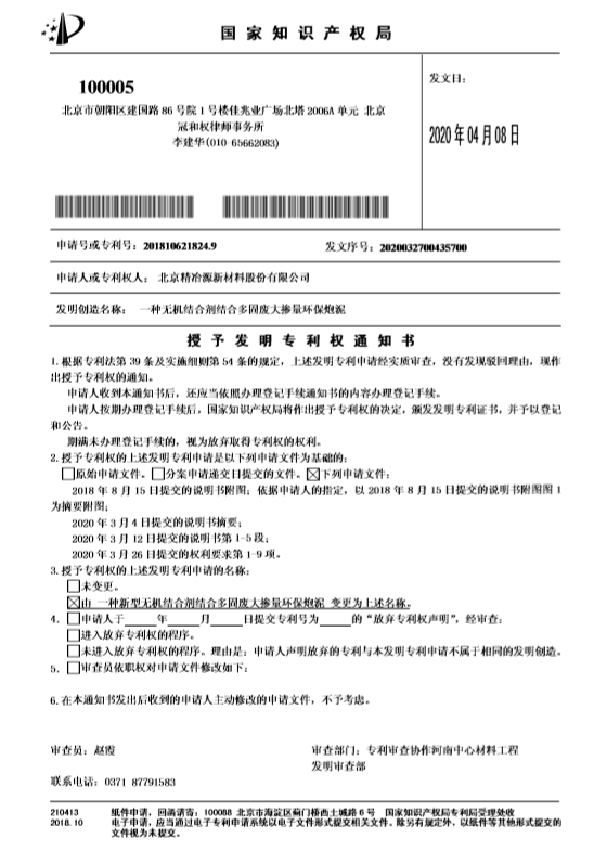 近日,由北京精冶源新材料河北有限公司(簡稱:精冶源;股票代碼:831091)研發(fā)的一種新型結合劑環(huán)保炮泥喜獲國家知識產(chǎn)權局發(fā)明專利授權,專利號:201810621824.9。這是精冶源在爐前炮泥領域獲得的第四項國家專利。 傳統(tǒng)炮泥大多以焦油或樹脂為結合劑,存在諸多缺點:焦油系炮泥在使用過程中會產(chǎn)生苯并芘,污染環(huán)境并危…